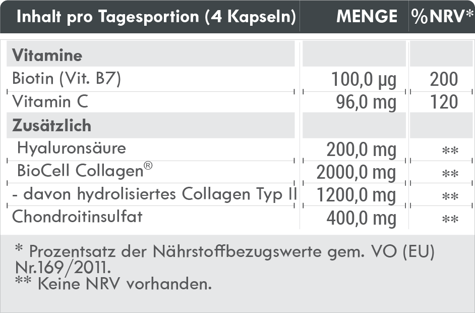 | BioCell Collagen® (bestehend aus): – hydrolysiertes Kollagen Typ II – Chondroitinsulfat – Hyaluronsäure | 2000 mg 1200 mg 400 mg 200 mg | – – – – |