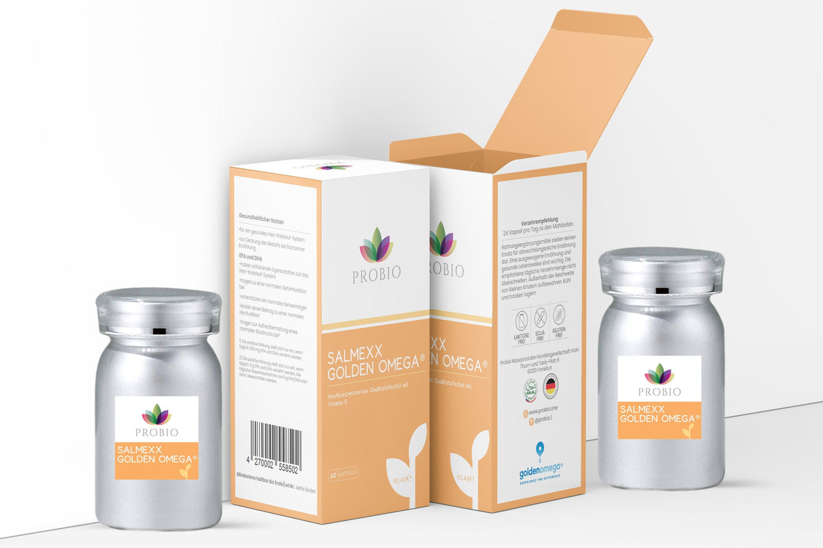 Salmexx Golden Omega® liefert hochreines Omega-3-Fischöl aus nachhaltigem Wildfang – reich an EPA und DHA. Diese beiden essenziellen Fettsäuren tragen zur normalen Herzfunktion bei, unterstützen die Gehirnleistung und helfen, die Sehkraft zu erhalten.* Jede Charge wird streng laborgeprüft, damit Sie sich auf maximale Reinheit und Qualität verlassen können.