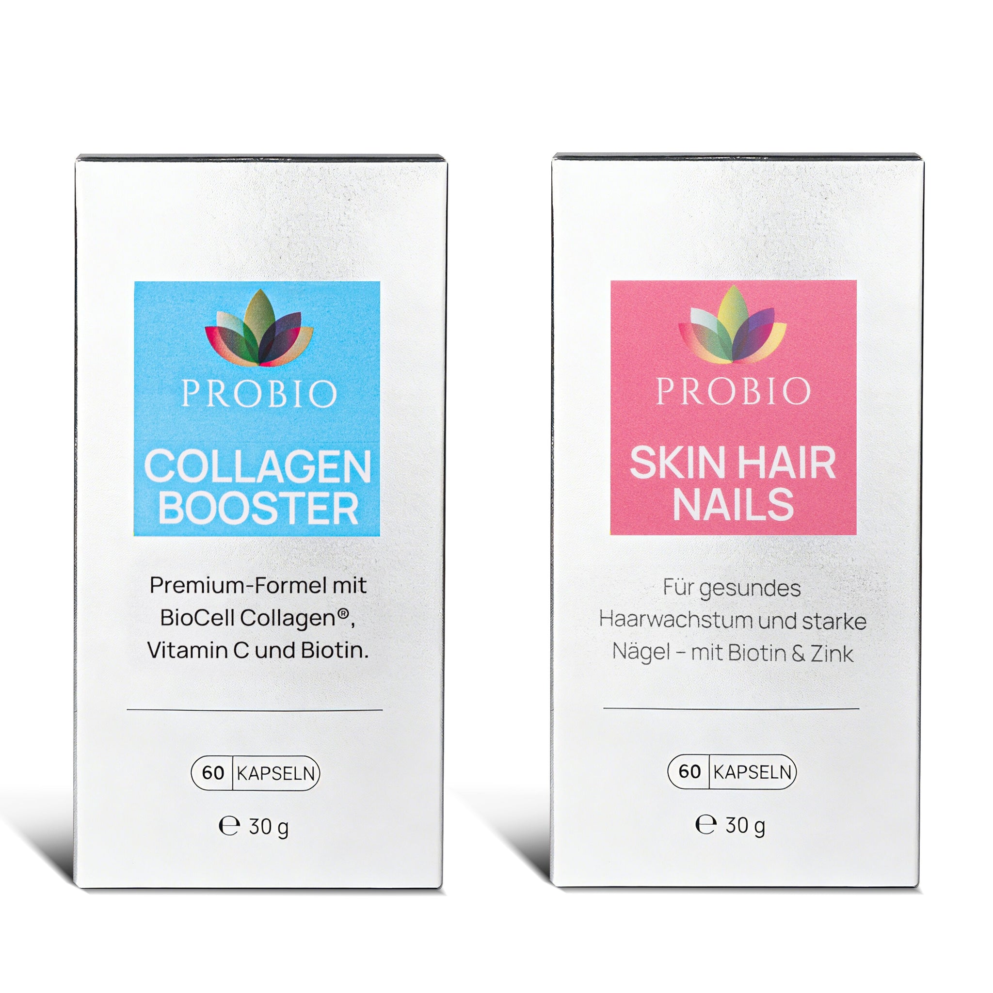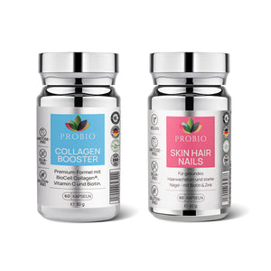 Premium-Beauty-Set für Haut, Haare & Nägel mit klarer Struktur: Collagen BOOSTER für die Matrix-Basis kombiniert mit Skin Hair Nails für Mikronährstoffe und charakteristische botanische Komponenten.